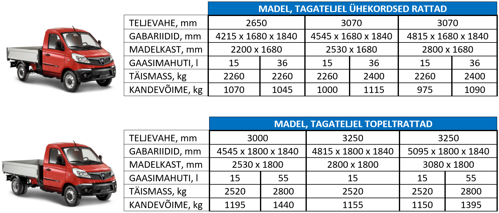 Madelkastide laiused on kõik kas 1680mm või 1800 mm olenevalt kas tagateljel on kasutuses ühekordsed rattad või kahekordsed rattad.